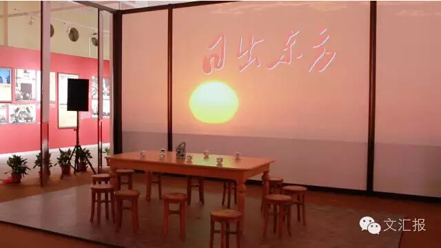 從老上海的“石庫門”中穿過,來到中共一大會址的會議“現場”,這里選擇性還原了“一大”最具特色和象征性的建筑元素和家具,并利用了原場景中的白墻作為主演繹投影幕,播放《日出東方》主題片。