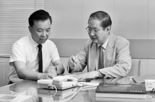 楊昌基與沙麟(左一)在談工作