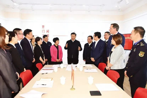 習近平總書記在長寧區虹橋街道古北市民中心,同參加法律草案意見建議征詢會的中外居民親切交談 2019年11月2日,習近平總書記在長寧區考察時,對虹橋街道全國人大常委會法工委基層立法聯系點建設等工作給予肯定,首次提出“人民民主是一種全過程的民主”。