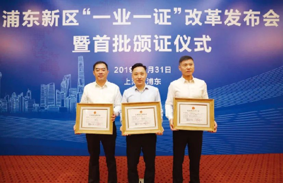上海自貿區制度創新實現“四確立、四形成”,臨港新片區基本形成“五自由一便利”制度型開放體系,全面深化“放管服”改革。上圖為2021年1月20日實現全域封關驗收的全國唯一的特殊綜合保稅區——洋山特殊綜合保稅區;下圖為2019年7月31日,首批頒證企業代表在浦東新區“一業一證”改革發布會暨首批頒證儀式上合影