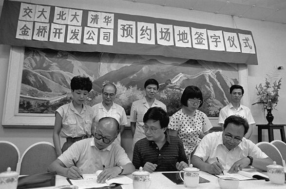 1991年8月8日,上海交通大學、北京大學、清華大學與上海浦東開發區金橋出口加工區開發公司簽署預約場地協議書,三所大學將在金橋開發區內聯合建立科技開發基地。新華社資料圖