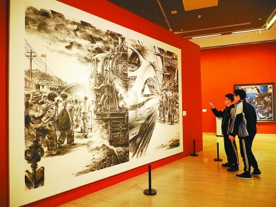 圖為“打開的窗口是美麗的——慶祝新中國成立70周年暨深圳建市40周年美術作品展”現場。畫中內容通過今昔對比,反映了人民群眾出行交通工具的發展變化。杜建坡攝光明圖片/視覺中國