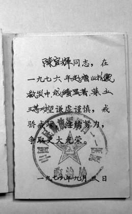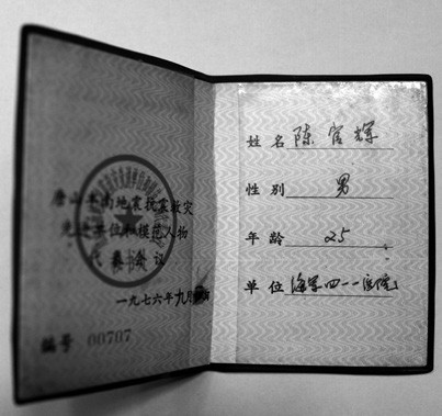 陳官輝在唐山抗震救災中榮獲三等功的榮譽證書