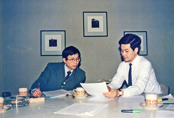 1988年1月25日至2月13日,虹橋26號地塊國際招標(biāo)文件起草組赴香港學(xué)習(xí)。圖為王安德(左)與梁振英(右)討論招標(biāo)文件。